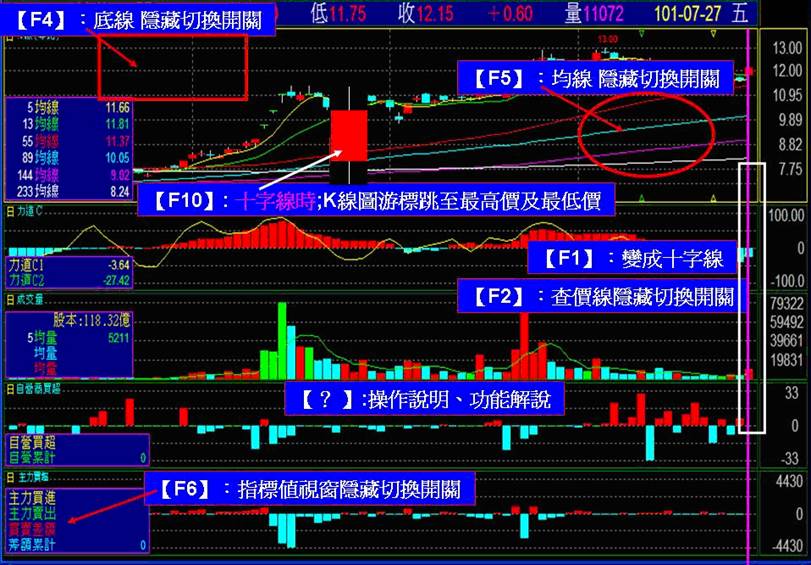 12.雷達週期線:查線變成十字線(F1);K線圖中選擇波段之最高最低,F8